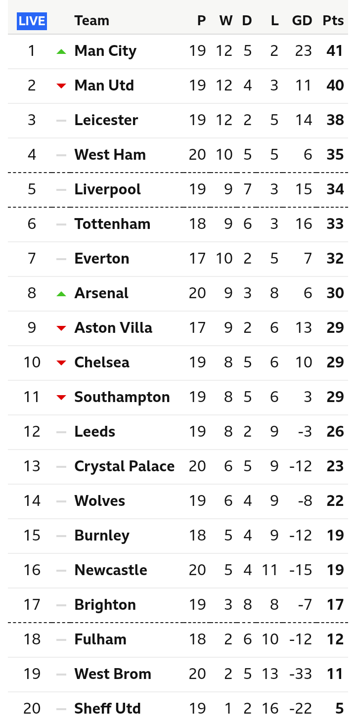 Complete table of premier league standings for the 2020/2021 season, plus access to tables from past seasons and other football leagues premier league fixtures. Arsenal stunned chelsea during a bumper boxing day round of fixtures that had repercussions at both ends of the premier league table.